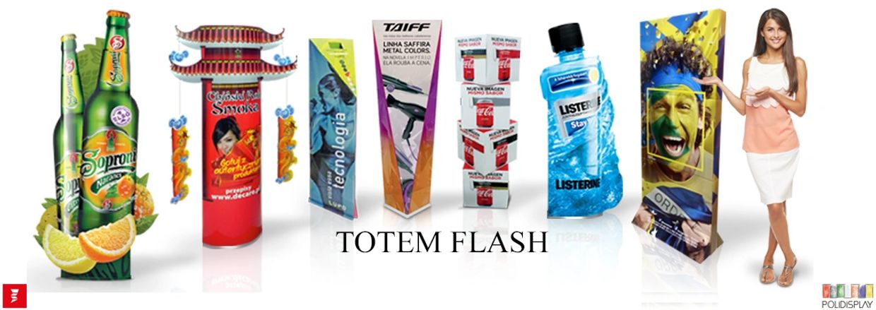 A possibilidade de criar facilmente curvas no display deixa muito atrativo e fácil sua comunicação com o consumidor final. O tradicional suporte americanos é a estrutura mais comum visto no mercado. Nós da Polidisplay oferecemos os TOTENS Convencionais de papelão com o tradicional suporte americano, TOTENS Flash com sistema de montagem AUTOMÁTICO (display auto montável) e TOTENS em PLÁSTICO (plástico corrugado) para uma comunicação mais duradoura.